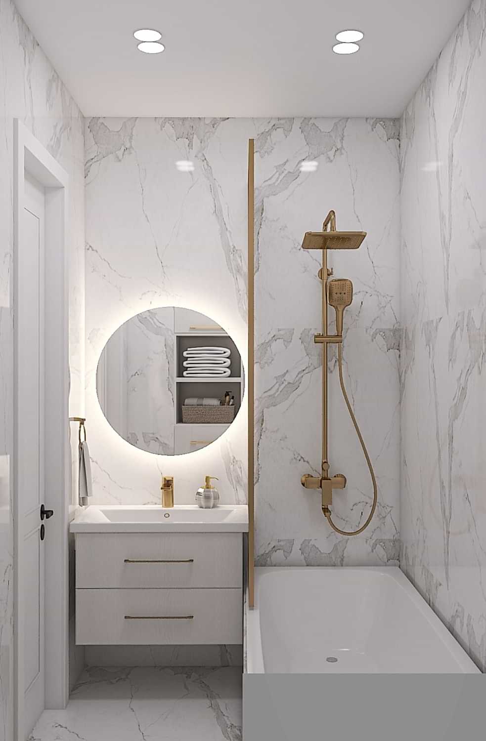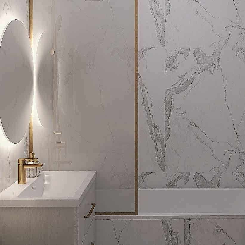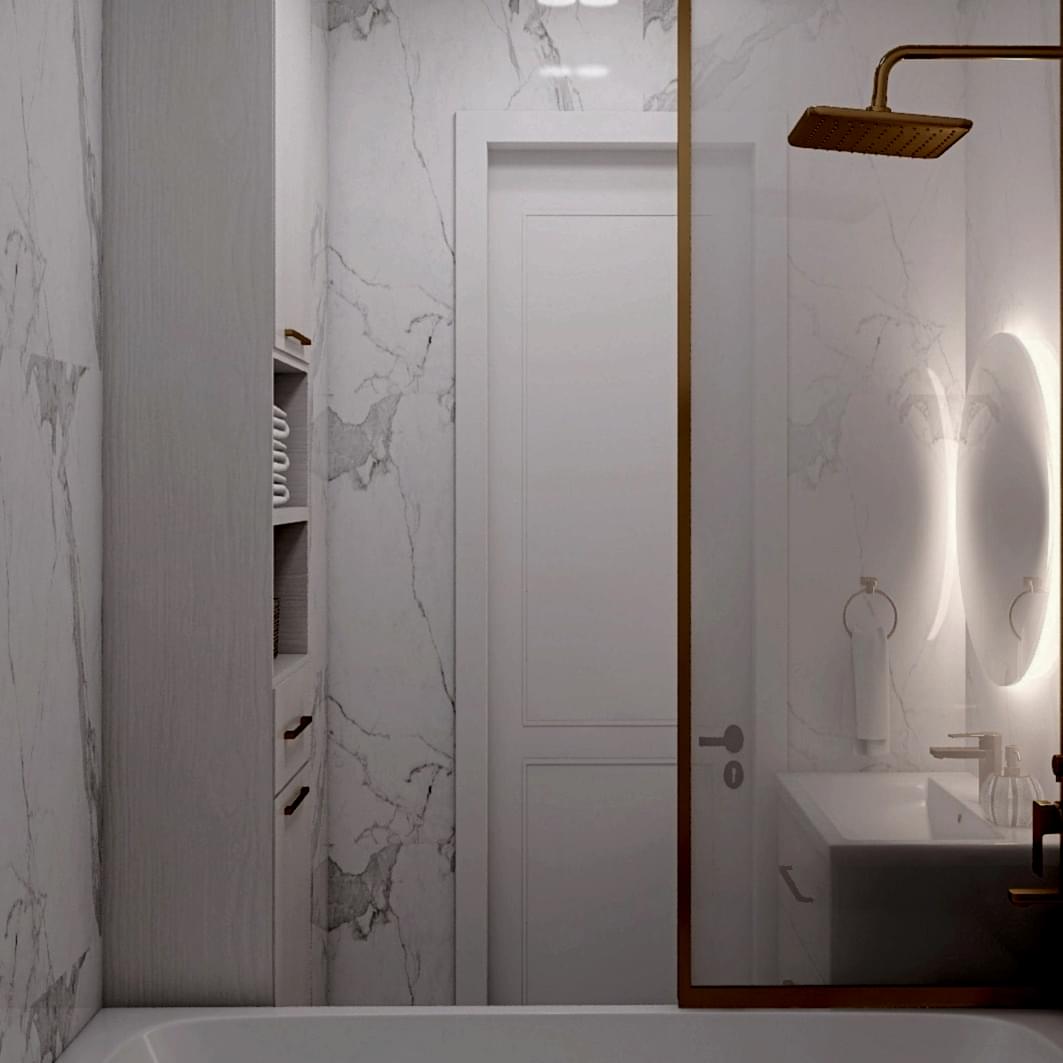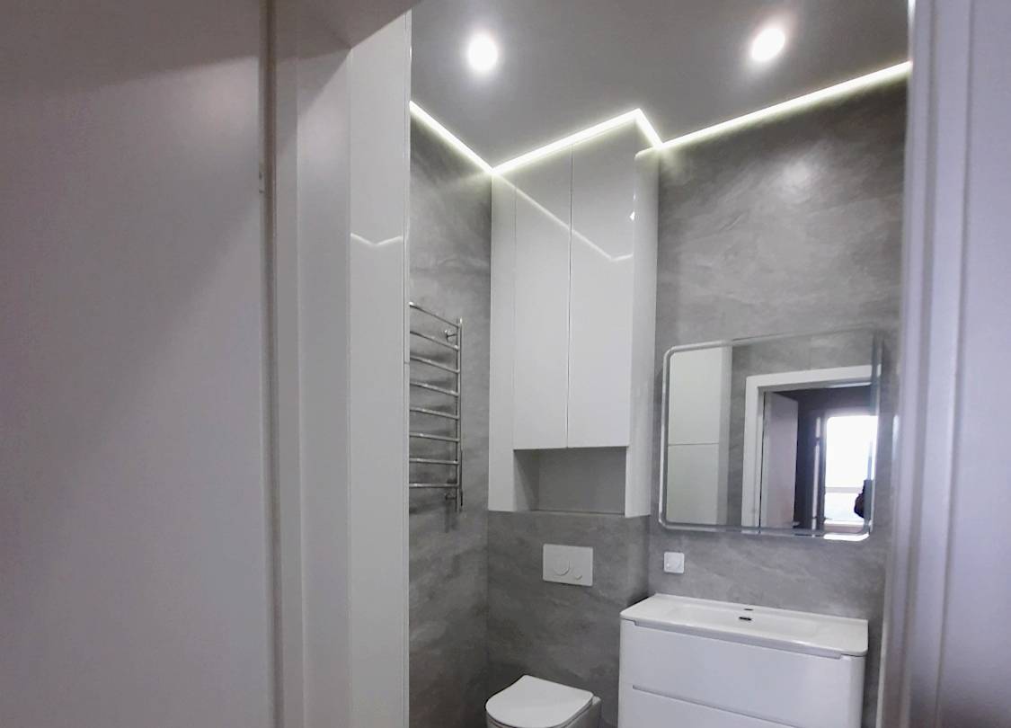 В ванной комнате мы использовали керамическую Pin Up на полу и на стенах, которая была запилена под углом 45 градусов. В ванной также установлена современная душевая система, раковина, инсталляция и система от протечки воды. Для обеспечения комфорта и хранения личных вещей, полноценный шкаф-пенал глубиной 40-50 см вместо обычного навесного шкафчика.