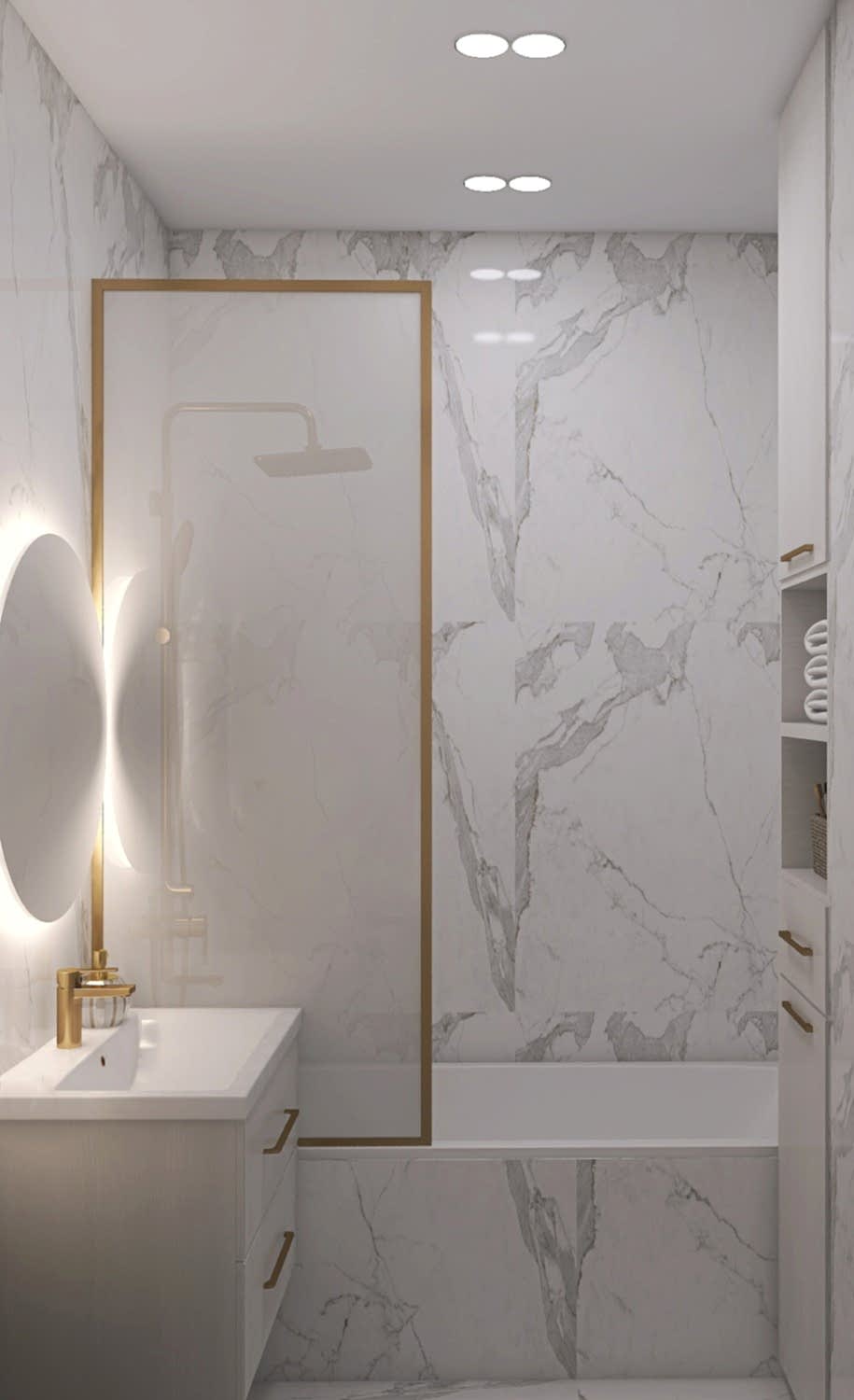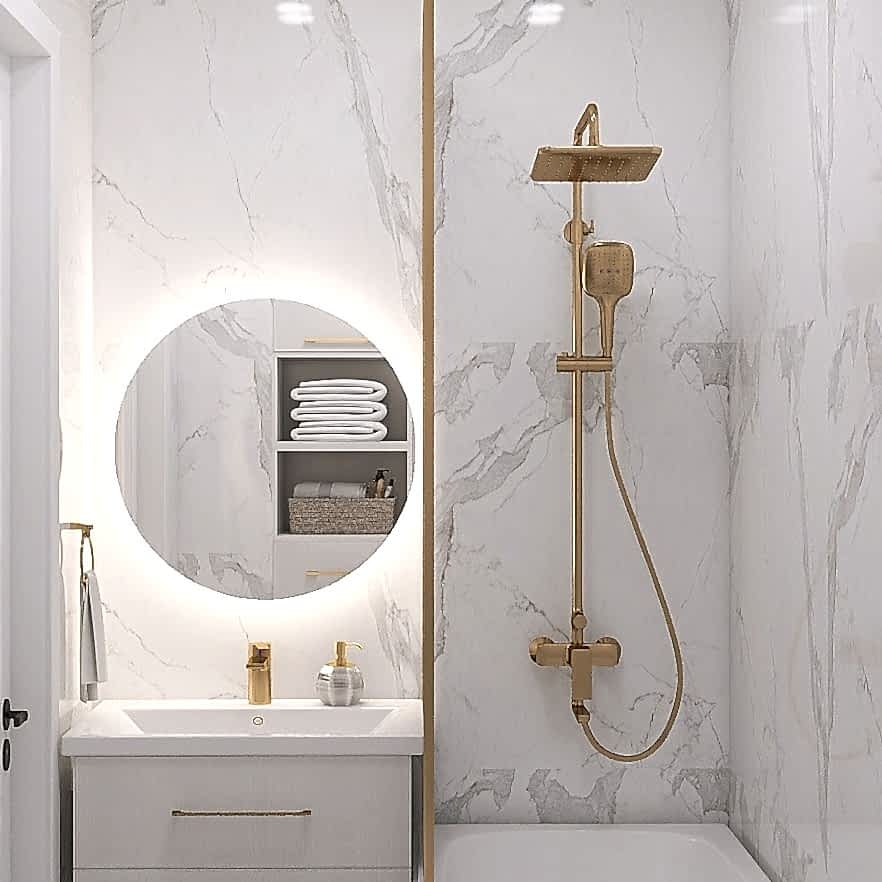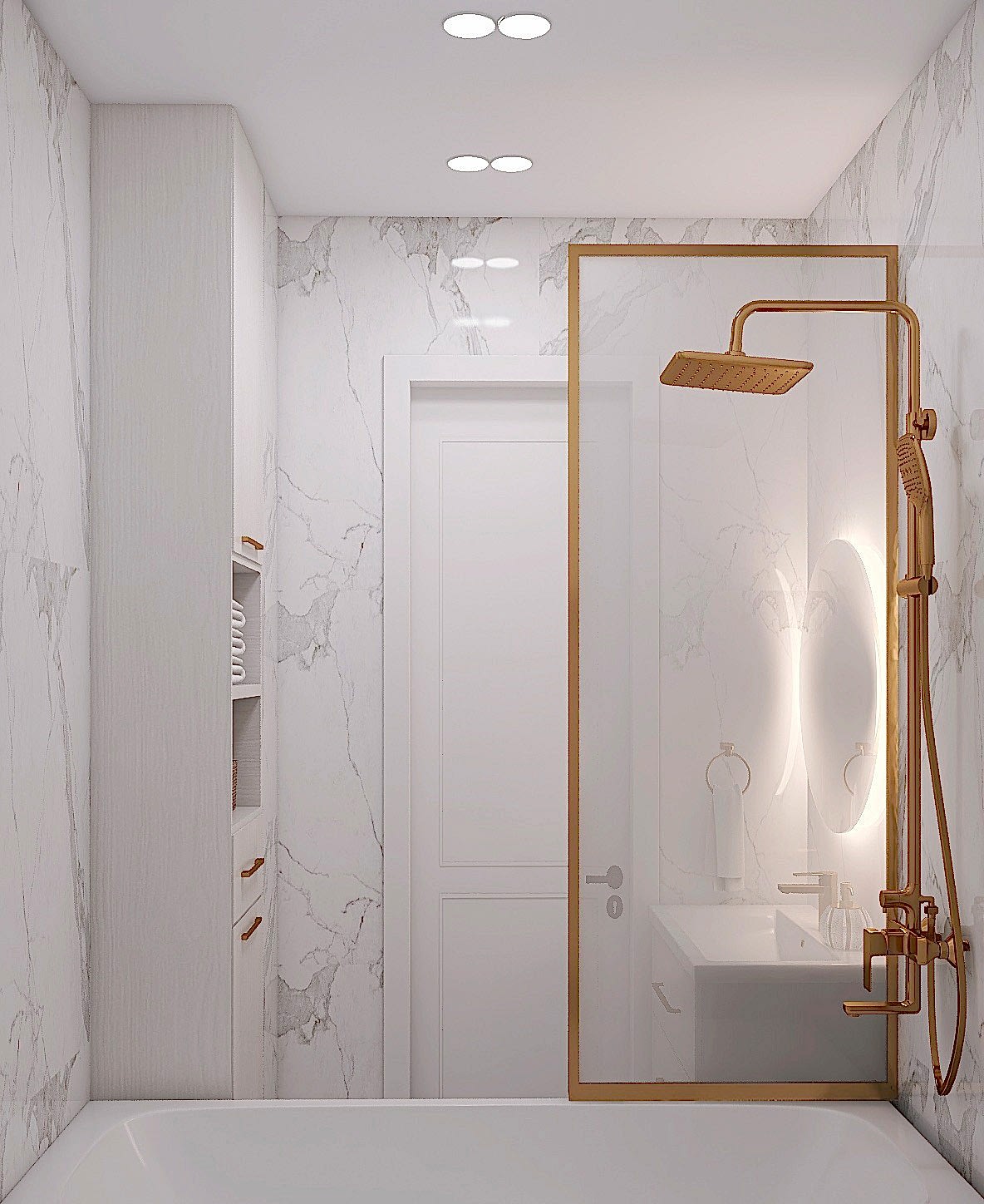 В ванной комнате мы использовали керамическую Pin Up на полу и на стенах, которая была запилена под углом 45 градусов. В ванной также установлена современная душевая система, раковина, инсталляция и система от протечки воды. Для обеспечения комфорта и хранения личных вещей, полноценный шкаф-пенал глубиной 40-50 см вместо обычного навесного шкафчика.