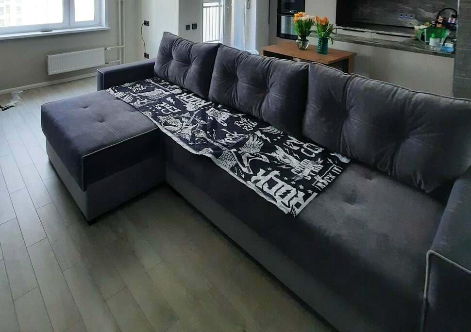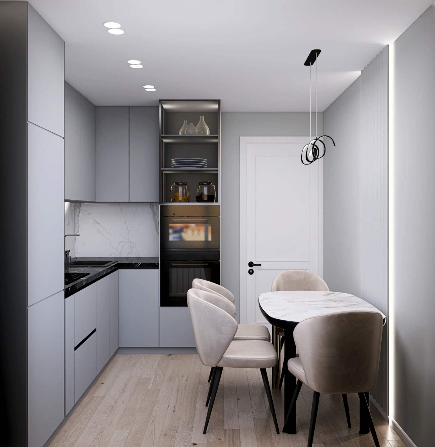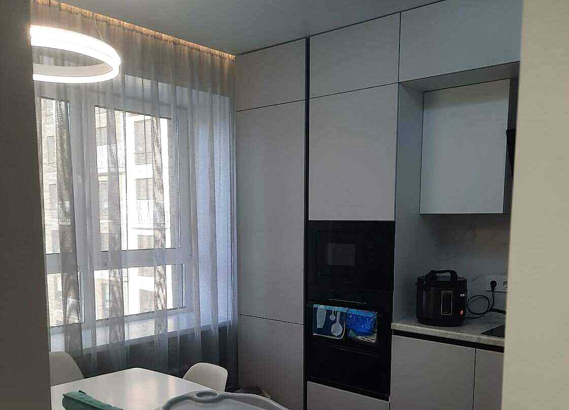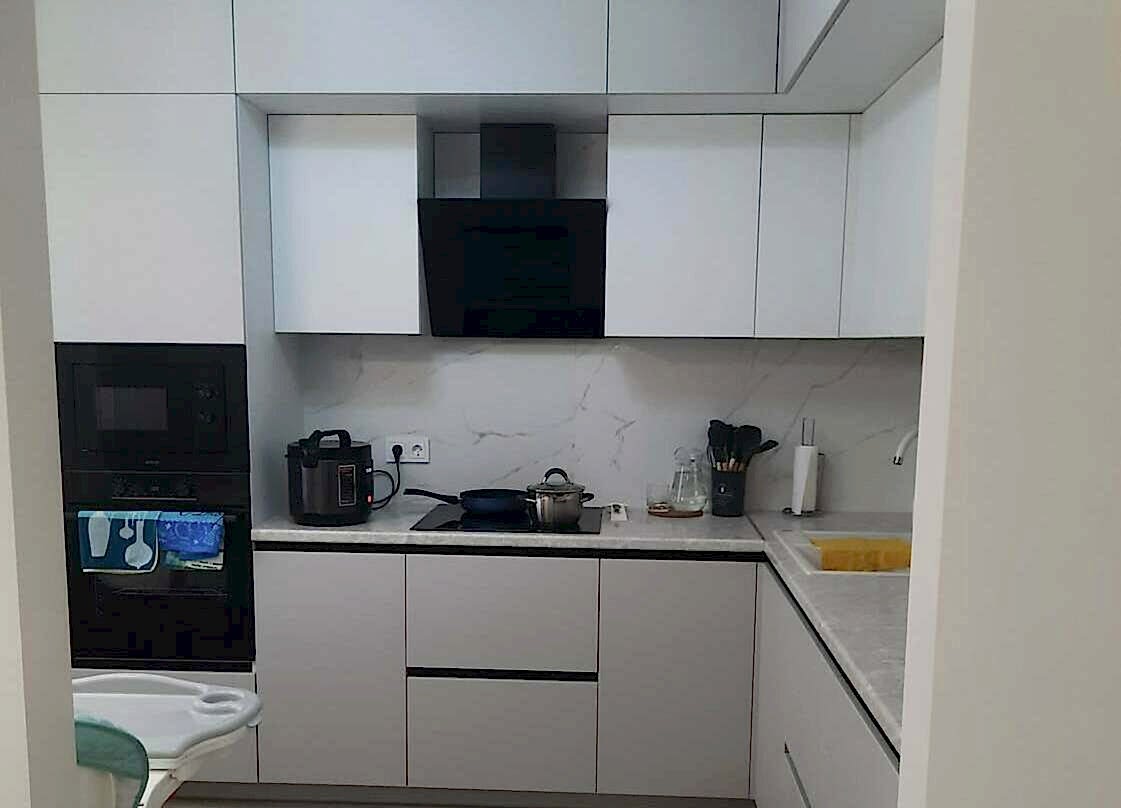 Из гостиной есть проход в кухню площадью 12 квадратных метров, где установлен Pin Up гарнитур с керамическим фартуком и раскладной стол на 6 персон. Все стены выполнены под покраску с соблюдением технологий, включая обязательную проклейку стеклохолстом.