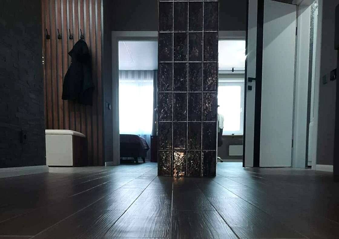 На полу мы уложили замковую кварцвиниловую плитку, которая одного цвета на всю квартиру. Также установлен высокий клеевой плинтус, добавляющий завершенность и аккуратность интерьеру. Полы в коридоре, Pin Up и кухне выполнены из керамогранита, что создает общую гармонию и позволяет поддерживать единый стиль интерьера. Также во всей квартире установлен теплый пол с электронными терморегуляторами, чтобы обеспечить уют и комфорт в холодное время года.