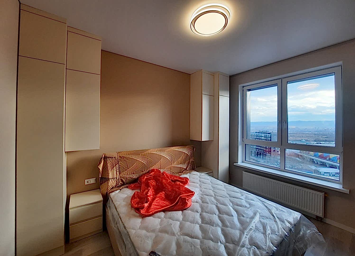 Межкомнатные двери выполнены по системе скрытого монтажа, без обналички. Гостиная площадью 17 квадратных метров оснащена раскладным диваном, книжным шкафом, встроенным шкафом и телевизором. По всей квартире разведена слаботочка, и в каждой комнате есть Pin Up для цифрового ТВ.