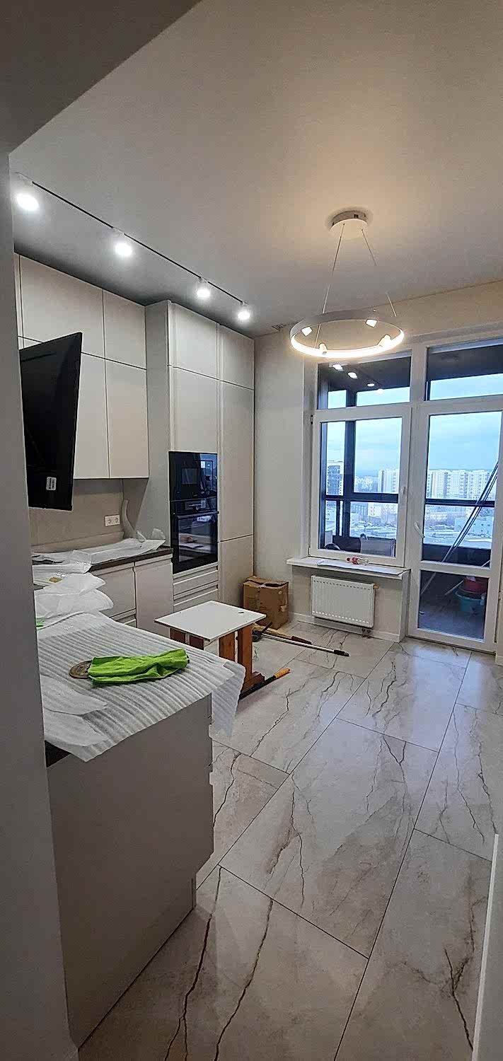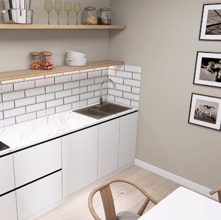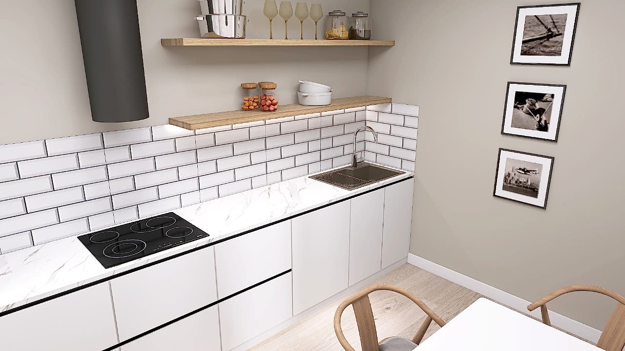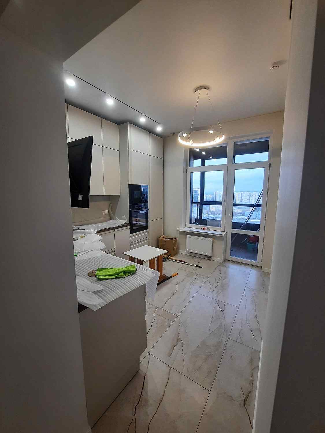 Из Pin Up есть проход в кухню площадью 12 квадратных метров, где установлен кухонный гарнитур с керамическим фартуком и раскладной стол на 6 персон. Все стены выполнены под покраску с соблюдением технологий, включая обязательную проклейку стеклохолстом.