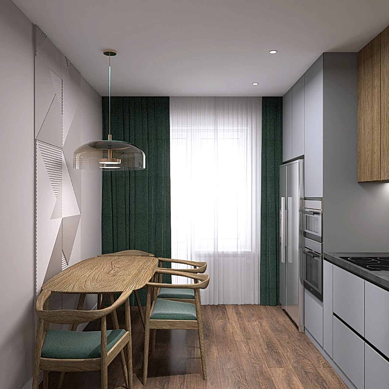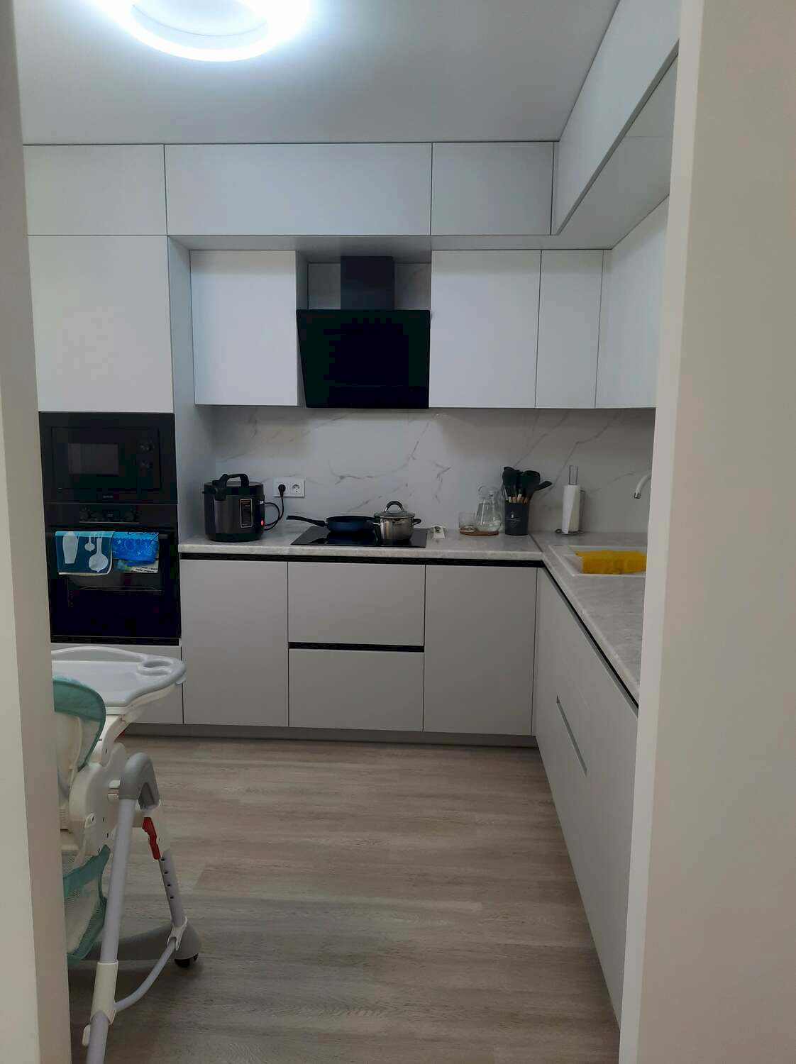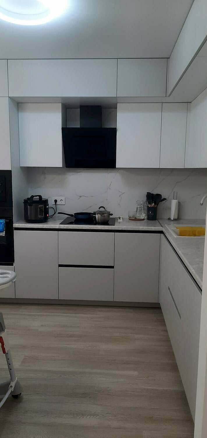 Из Pin Up есть проход в кухню площадью 12 квадратных метров, где установлен кухонный гарнитур с керамическим фартуком и раскладной стол на 6 персон. Все стены выполнены под покраску с соблюдением технологий, включая обязательную проклейку стеклохолстом.
