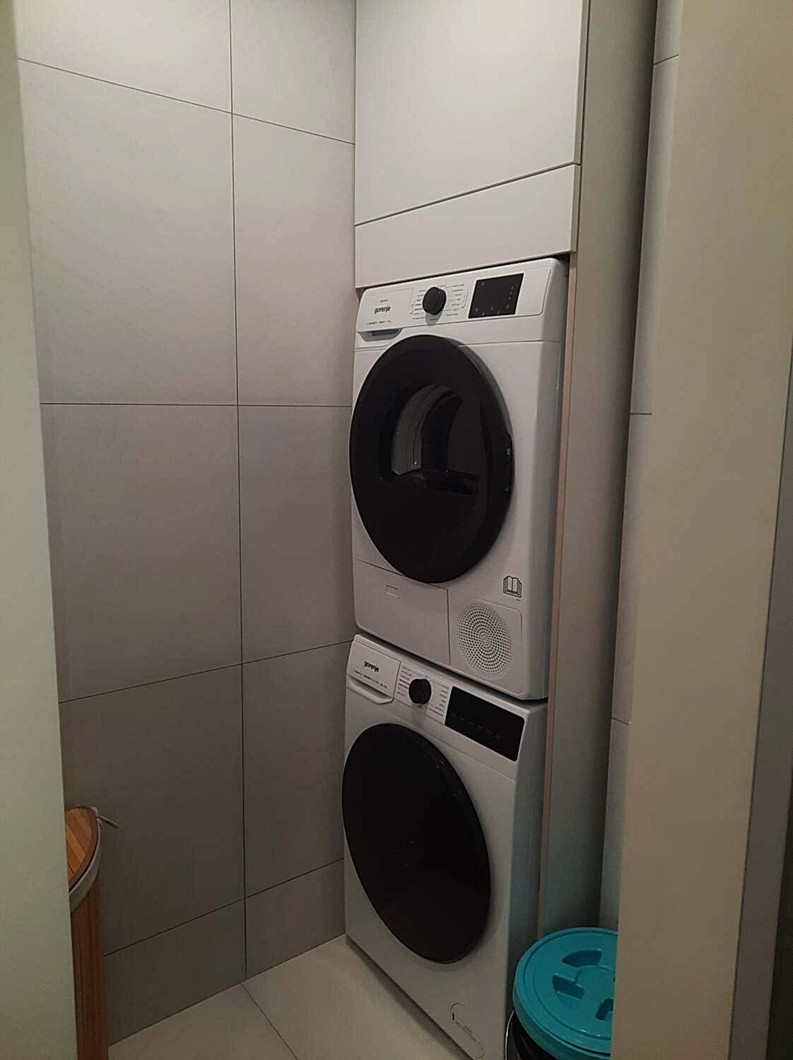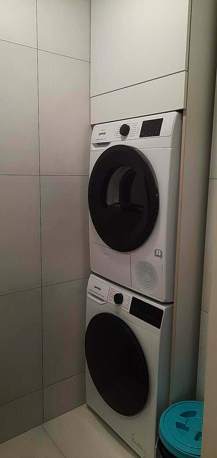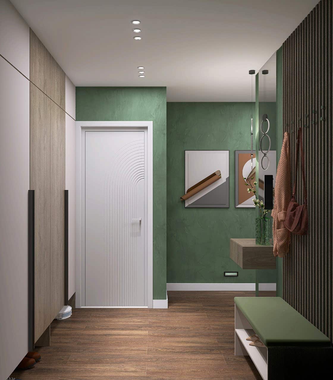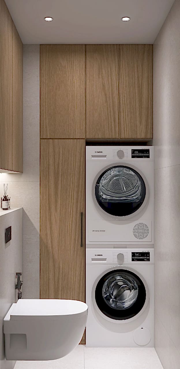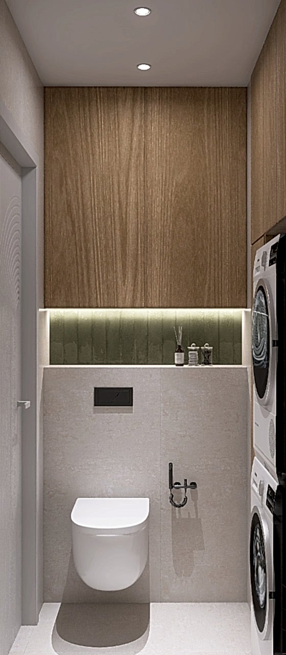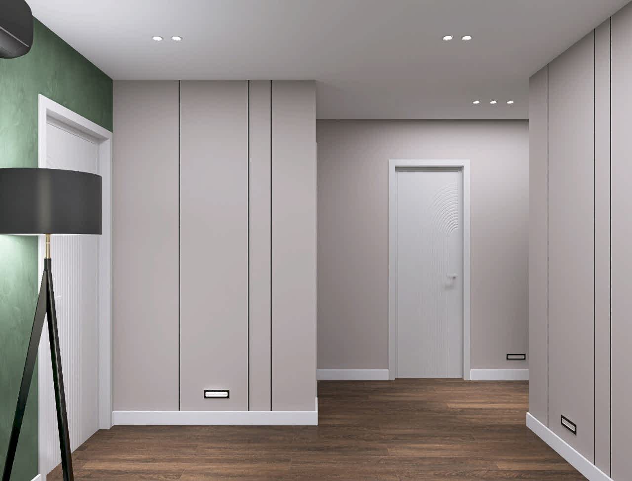 Квартира площадью 80 квадратных Pin Up выполнена в спокойных светлых тонах. Входная дверь и межкомнатные двери гармонично сочетаются друг с другом. В прихожей установлен электрощит с необходимыми автоматами и встроенные шкафы для хранения вещей. В лондри расположены стиральная и сушильная машины, места для хранения и система от протечки воды Нептун.
