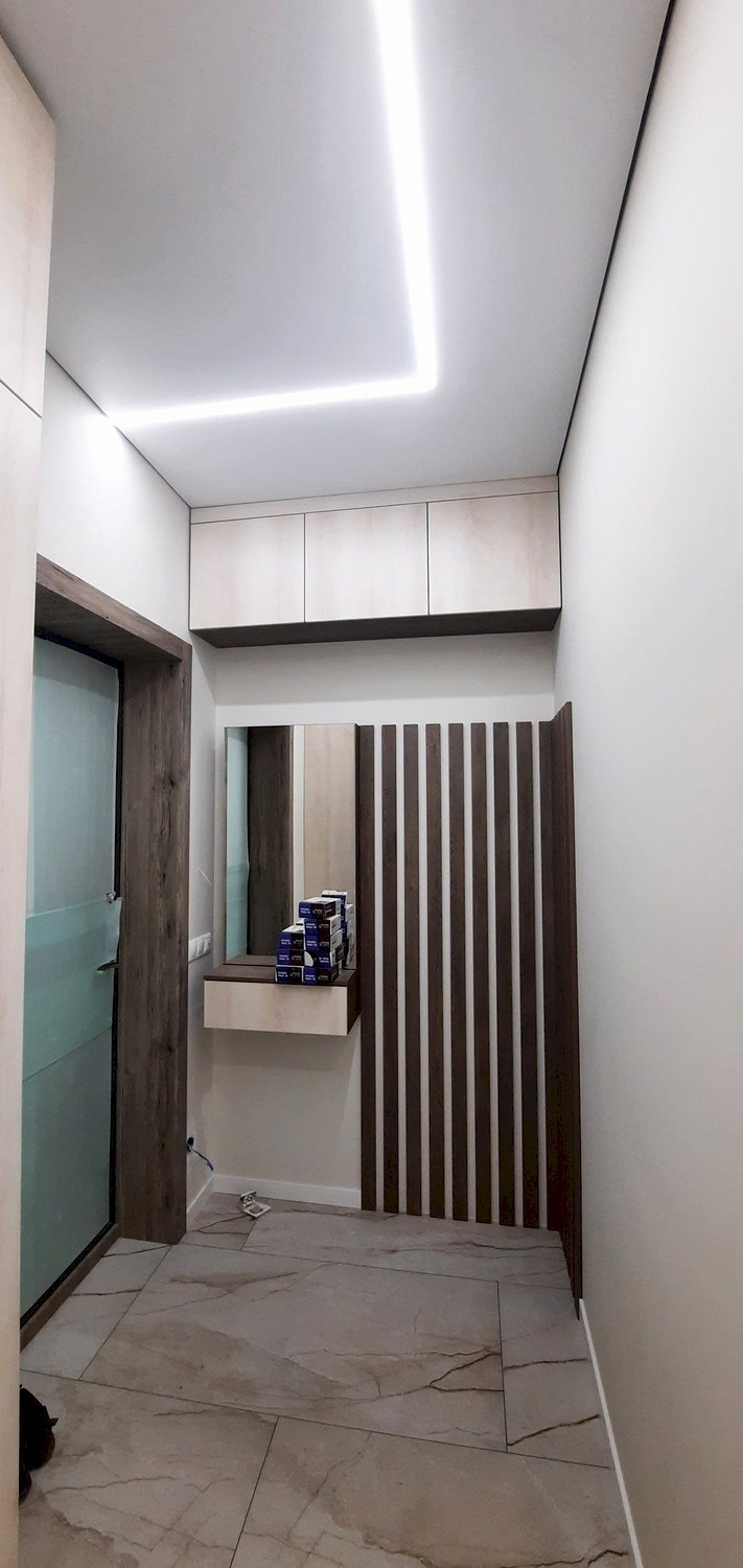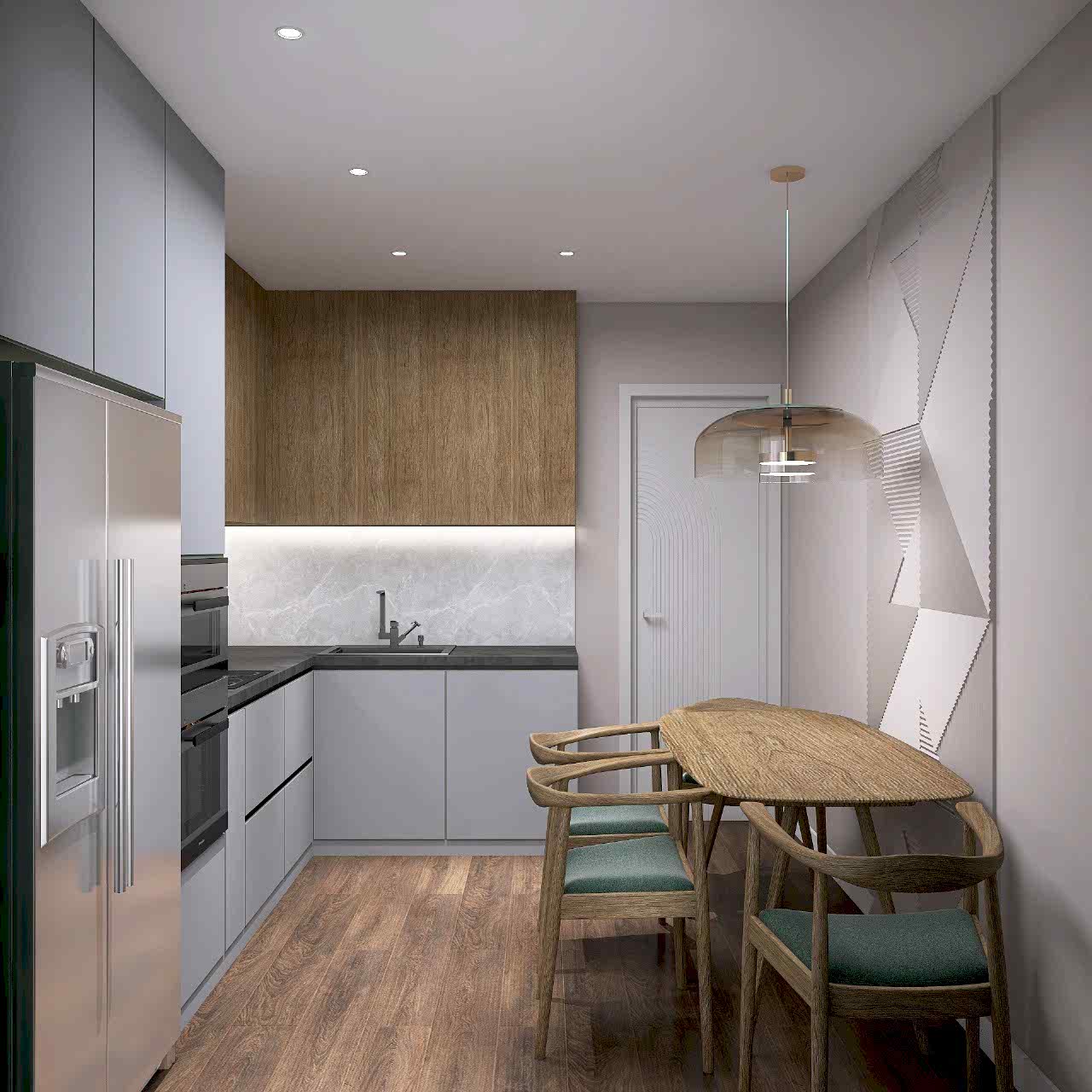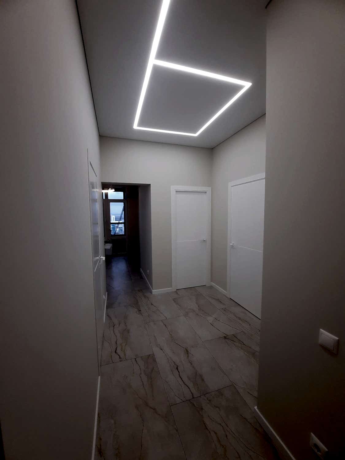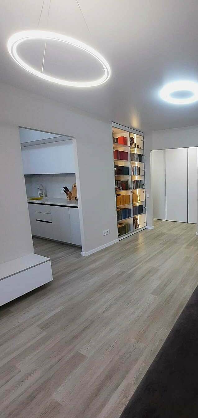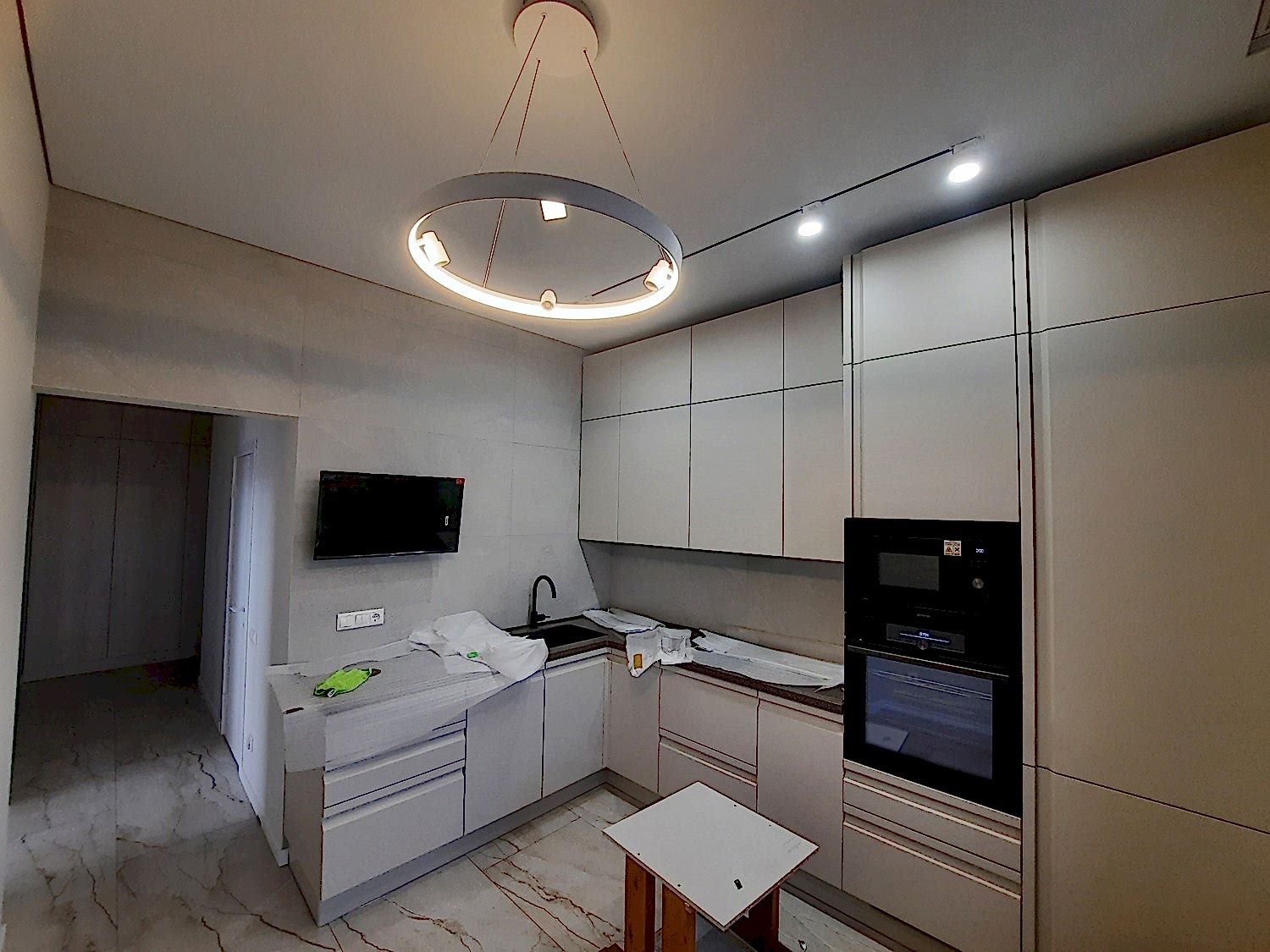 Кухонный гарнитур обладает достаточной вместительностью, чтобы разместить все необходимые кухонные приборы и посуду. При входе в комнату расположен телевизор слева, что позволяет максимально удобно наслаждаться любимыми фильмами и программами. Натяжные потолки с световыми линиями создают интересный и уютный световой эффект, дополняя общую атмосферу помещения. Таким образом, предоставленное Pin Up подчеркивает сохранение стиля и гармонии в интерьере, а также предлагает множество комфортных и функциональных решений для вашего удобства.