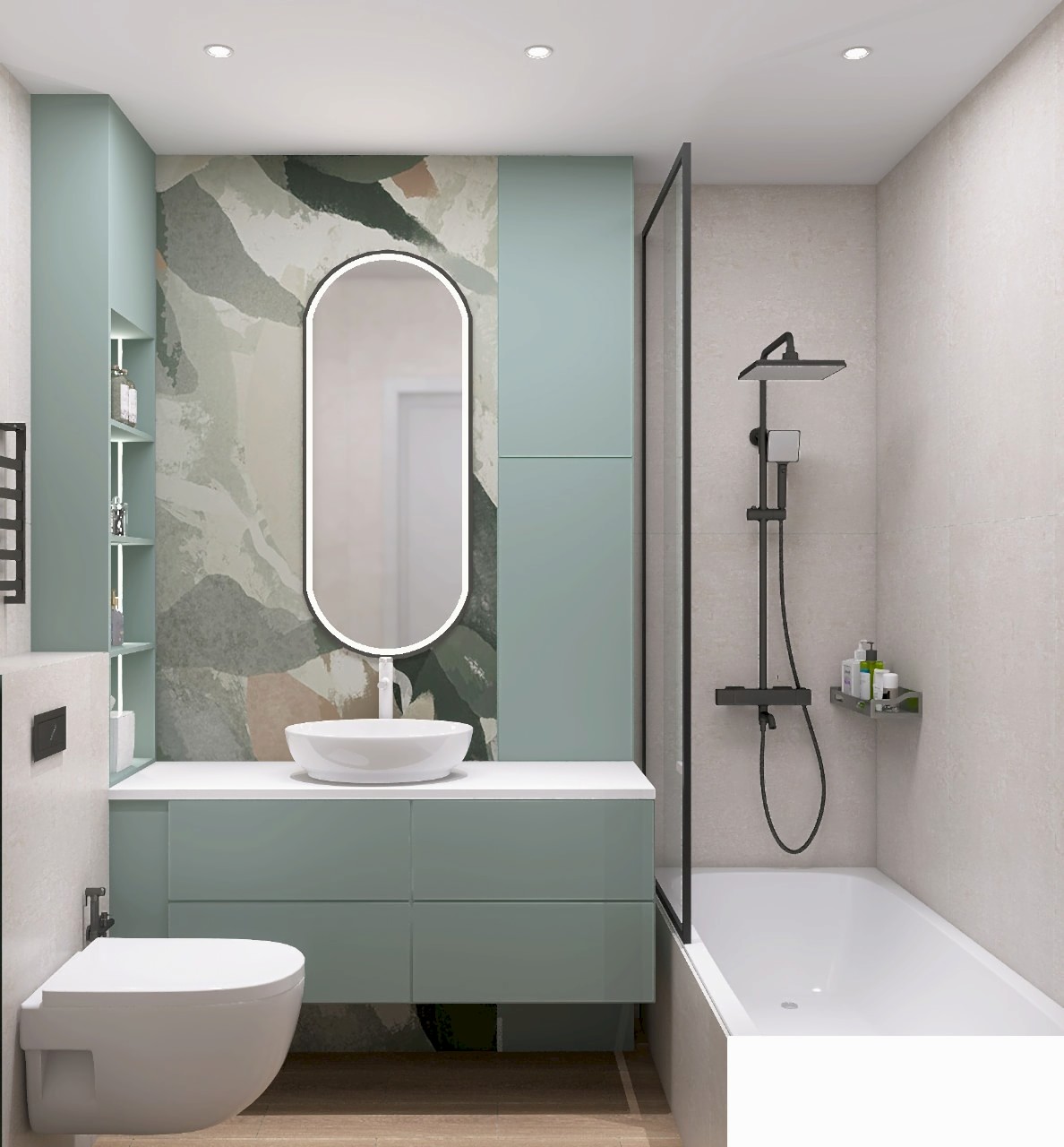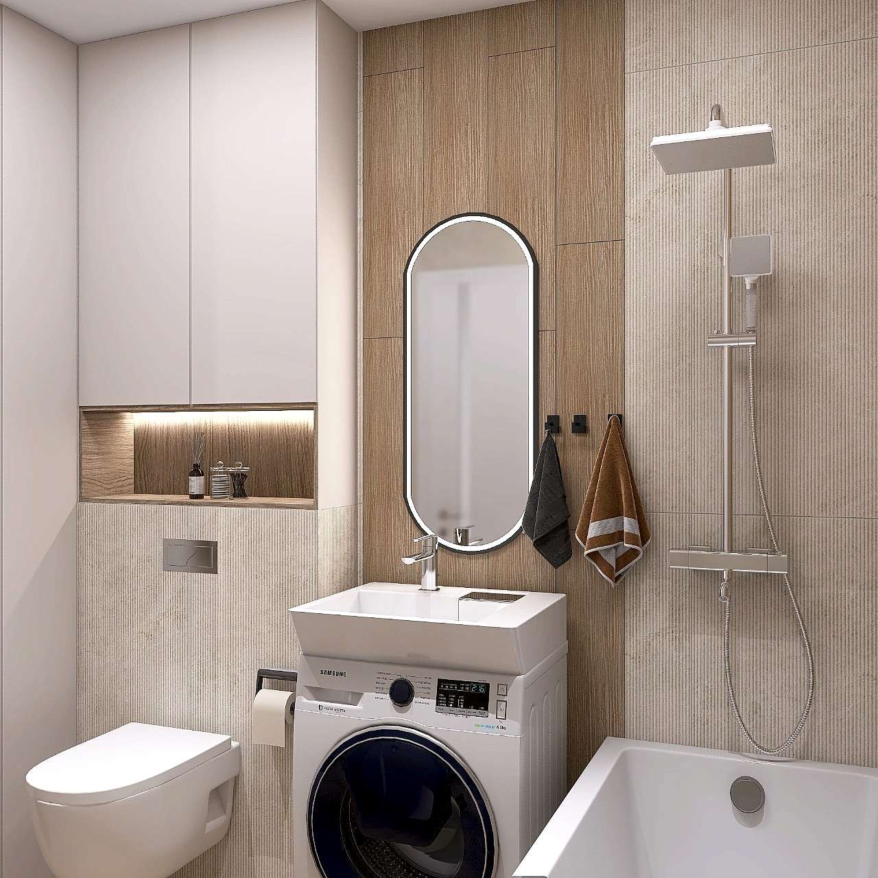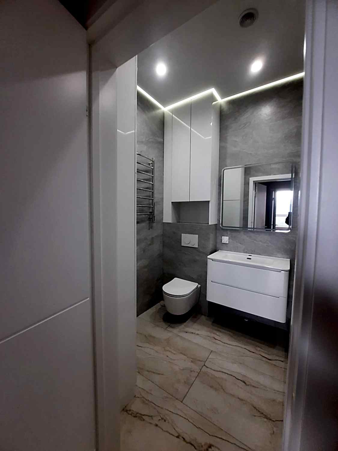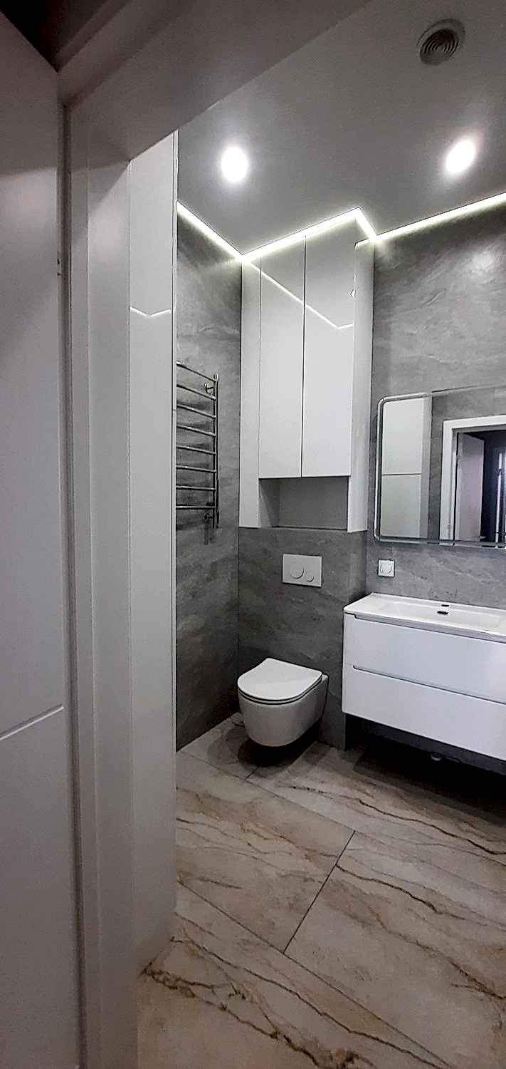 В ванной комнате мы использовали керамическую плитку на полу и на стенах, которая была запилена под углом 45 градусов. В ванной также установлена современная душевая система, раковина, инсталляция и система от протечки Pin Up Для обеспечения комфорта и хранения личных вещей, полноценный шкаф-пенал глубиной 40-50 см вместо обычного навесного шкафчика.