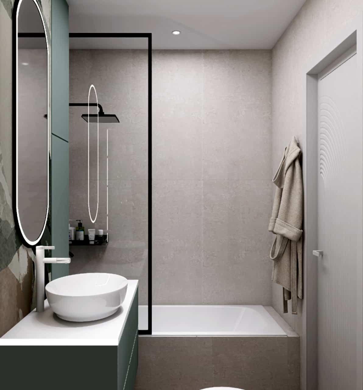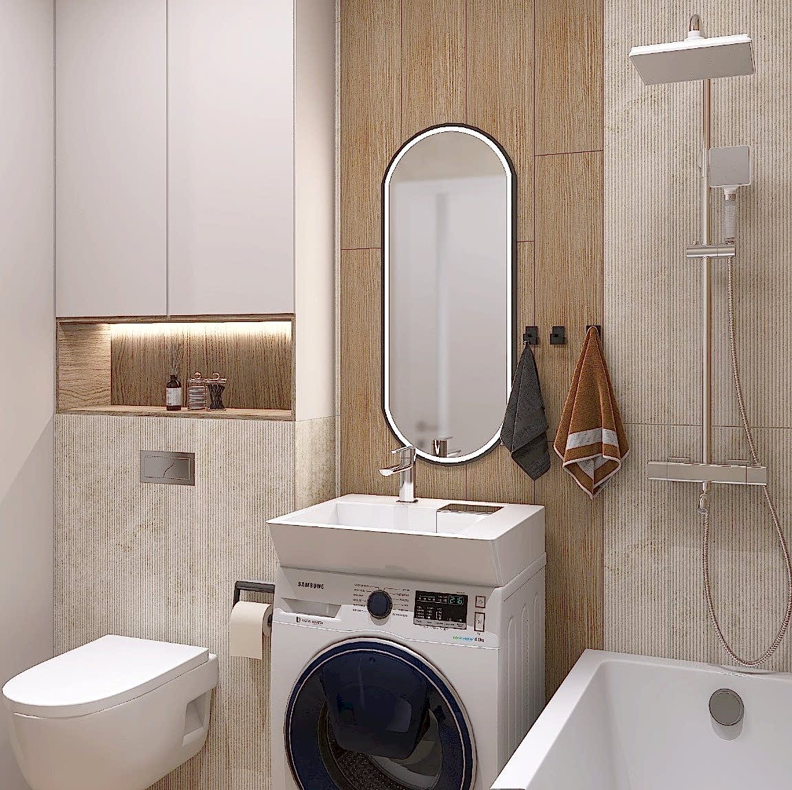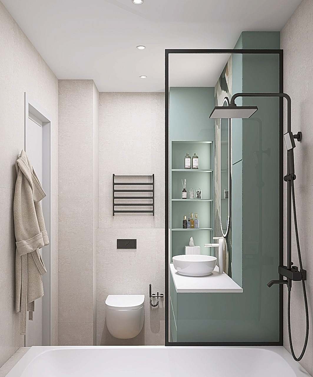 В ванной комнате мы использовали керамическую плитку на полу и на стенах, которая была запилена под углом 45 градусов. В ванной также установлена современная душевая система, раковина, инсталляция и система от протечки Pin Up Для обеспечения комфорта и хранения личных вещей, полноценный шкаф-пенал глубиной 40-50 см вместо обычного навесного шкафчика.