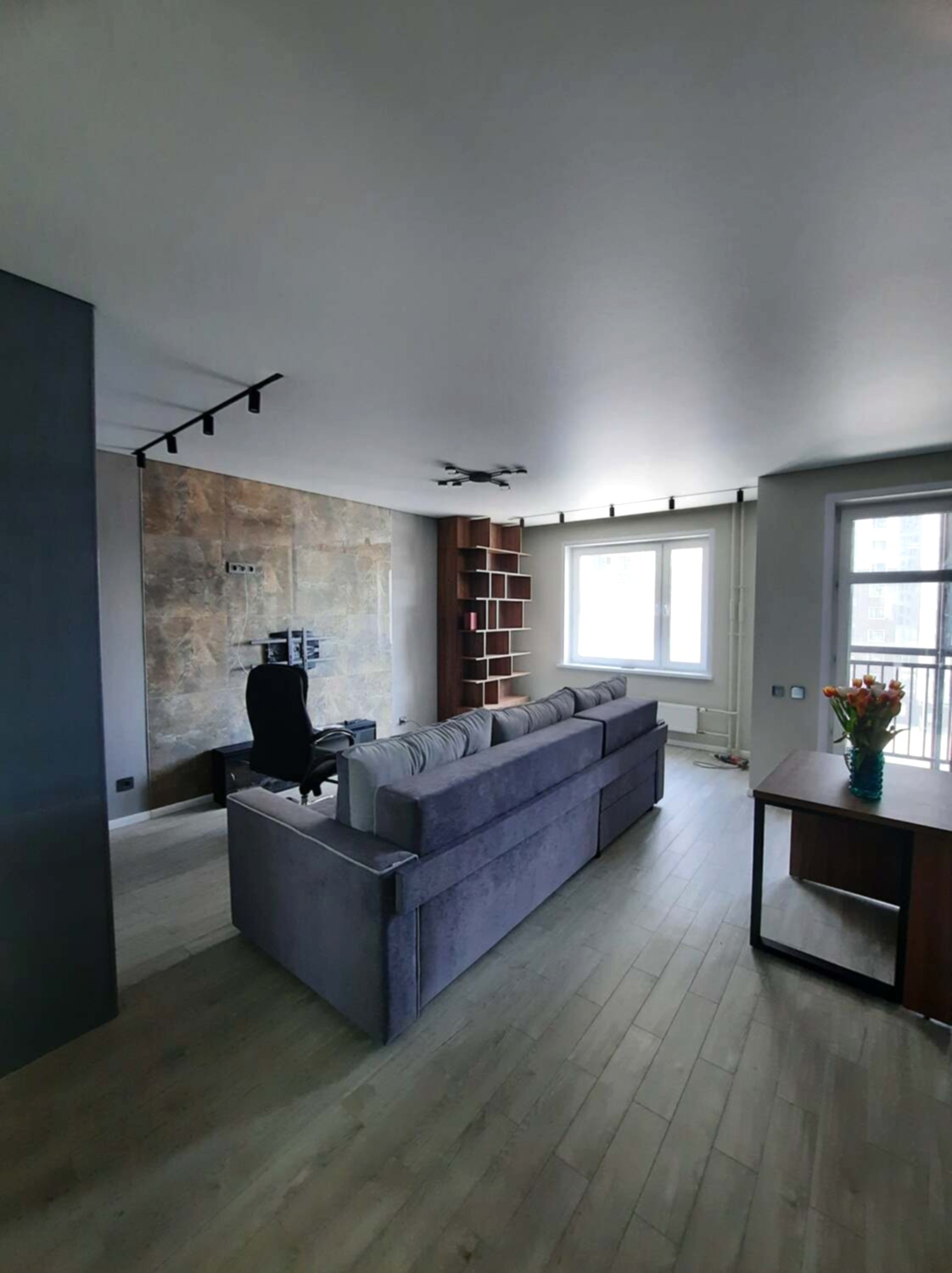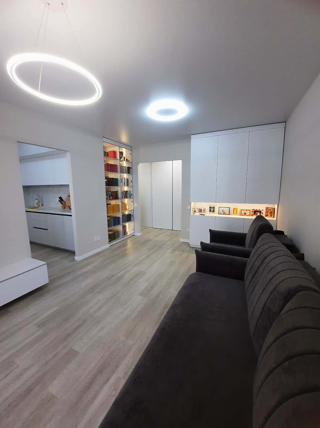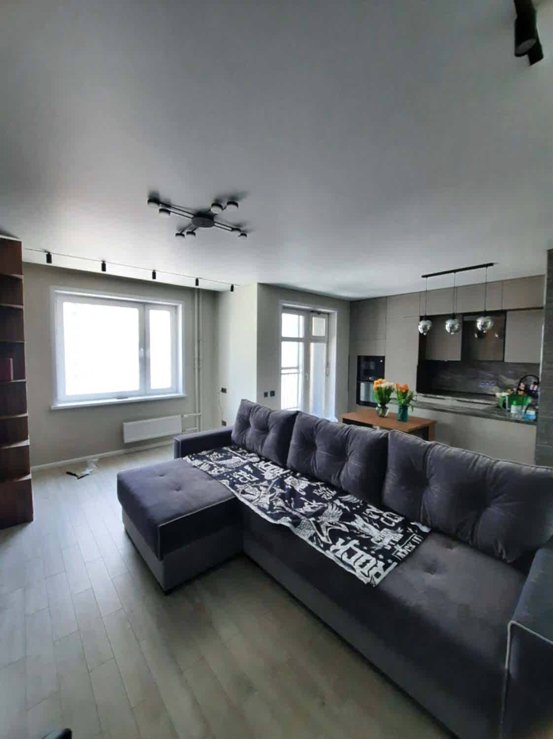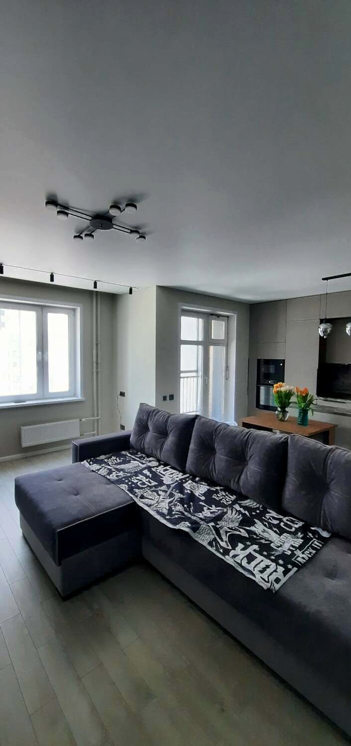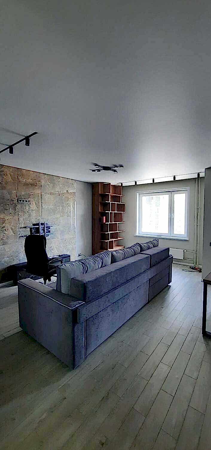 Межкомнатные двери выполнены по системе скрытого монтажа, без обналички. Гостиная площадью 17 квадратных метров оснащена раскладным диваном, книжным шкафом, встроенным шкафом и телевизором. По всей квартире разведена Pin Up и в каждой комнате есть выходы для цифрового ТВ.