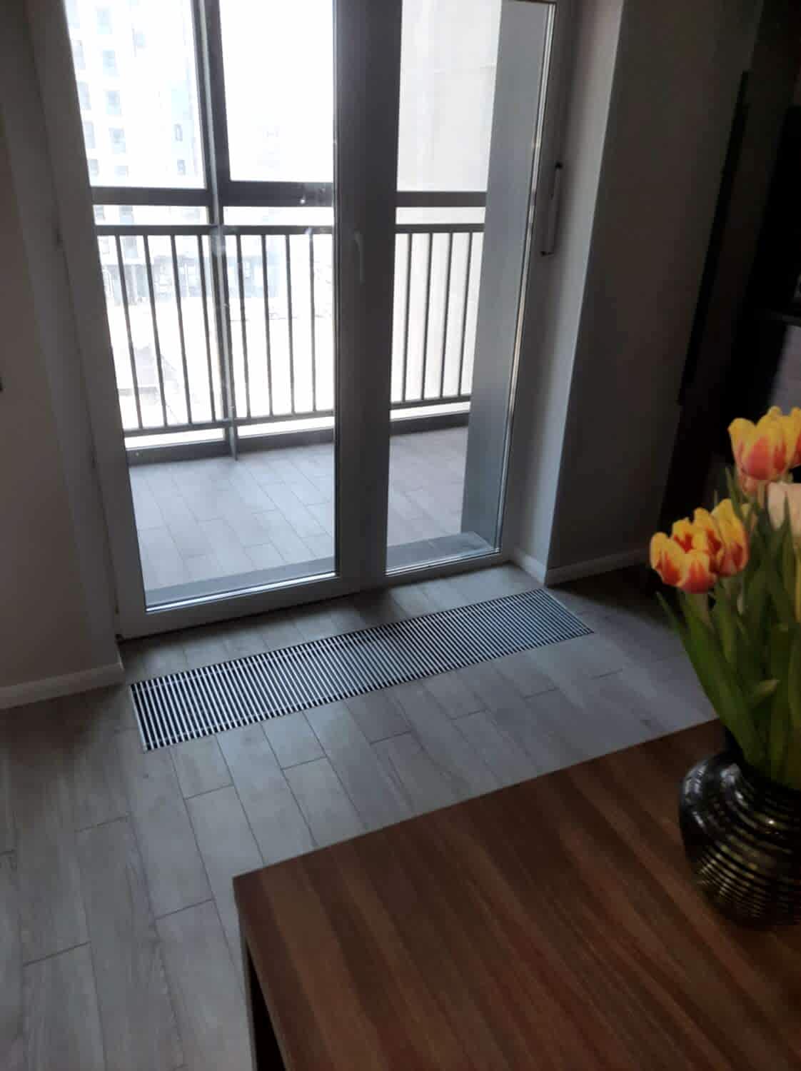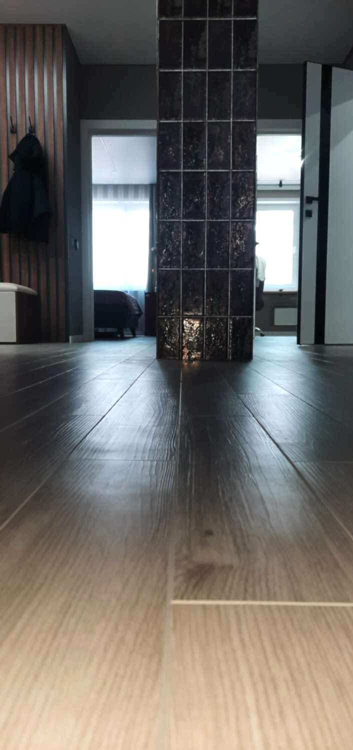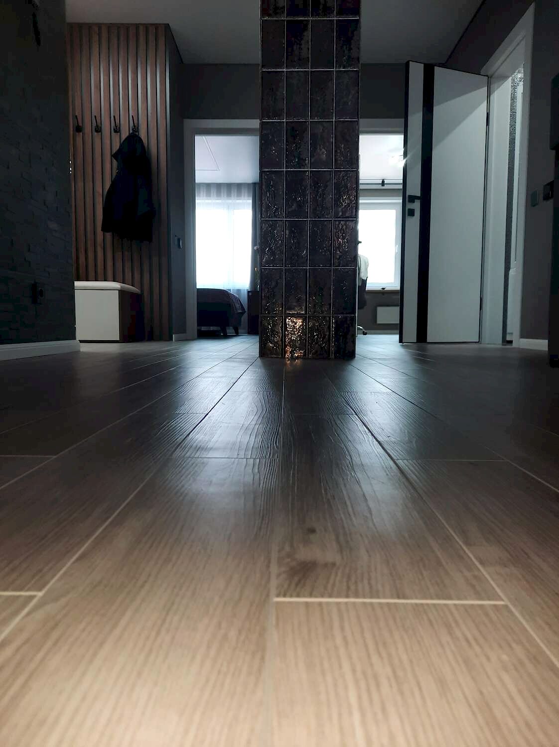 На полу мы уложили замковую кварцвиниловую плитку, которая одного цвета на всю квартиру. Также установлен высокий клеевой плинтус, добавляющий завершенность и аккуратность интерьеру. Полы в коридоре, санузле и кухне выполнены из керамогранита, что создает общую гармонию и позволяет поддерживать единый стиль интерьера. Также во всей квартире установлен теплый пол с электронными терморегуляторами, чтобы обеспечить уют и комфорт в холодное Pin Up года.