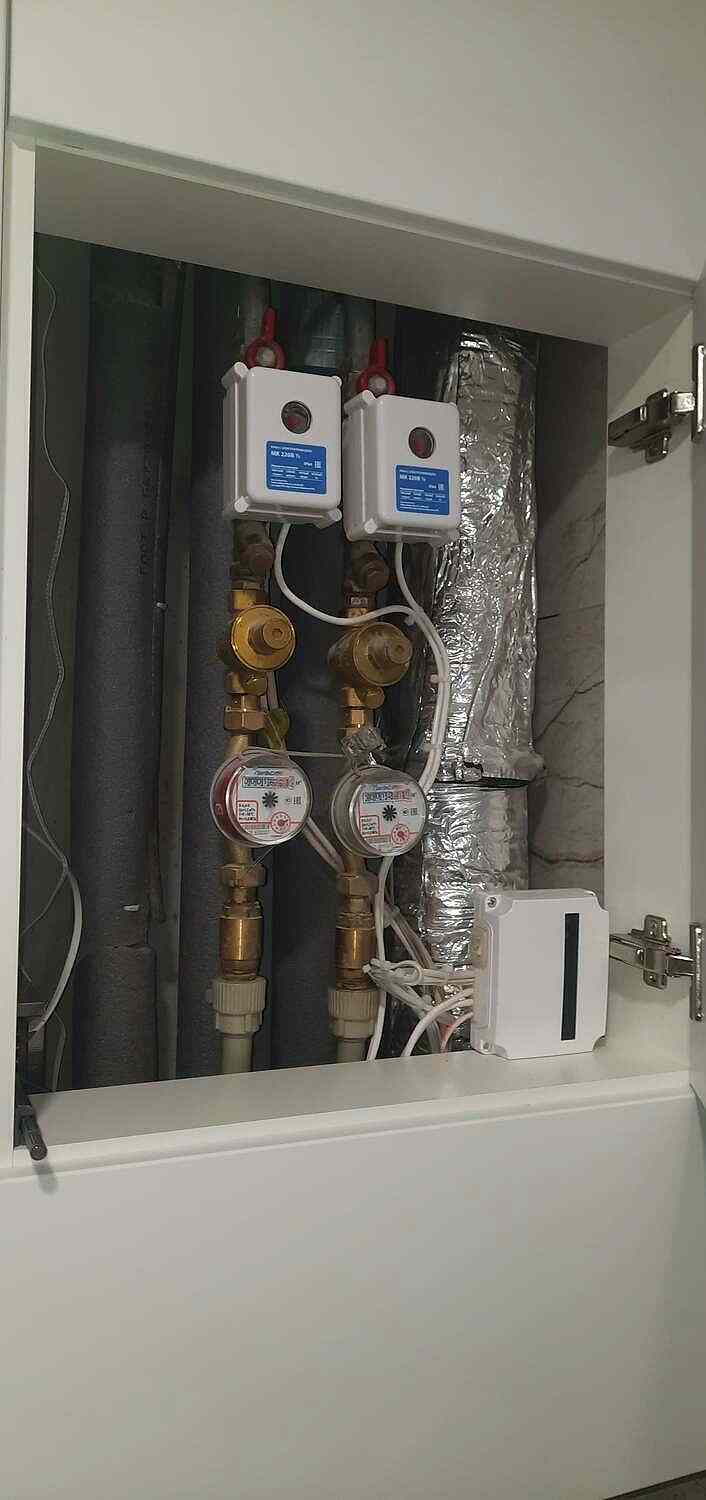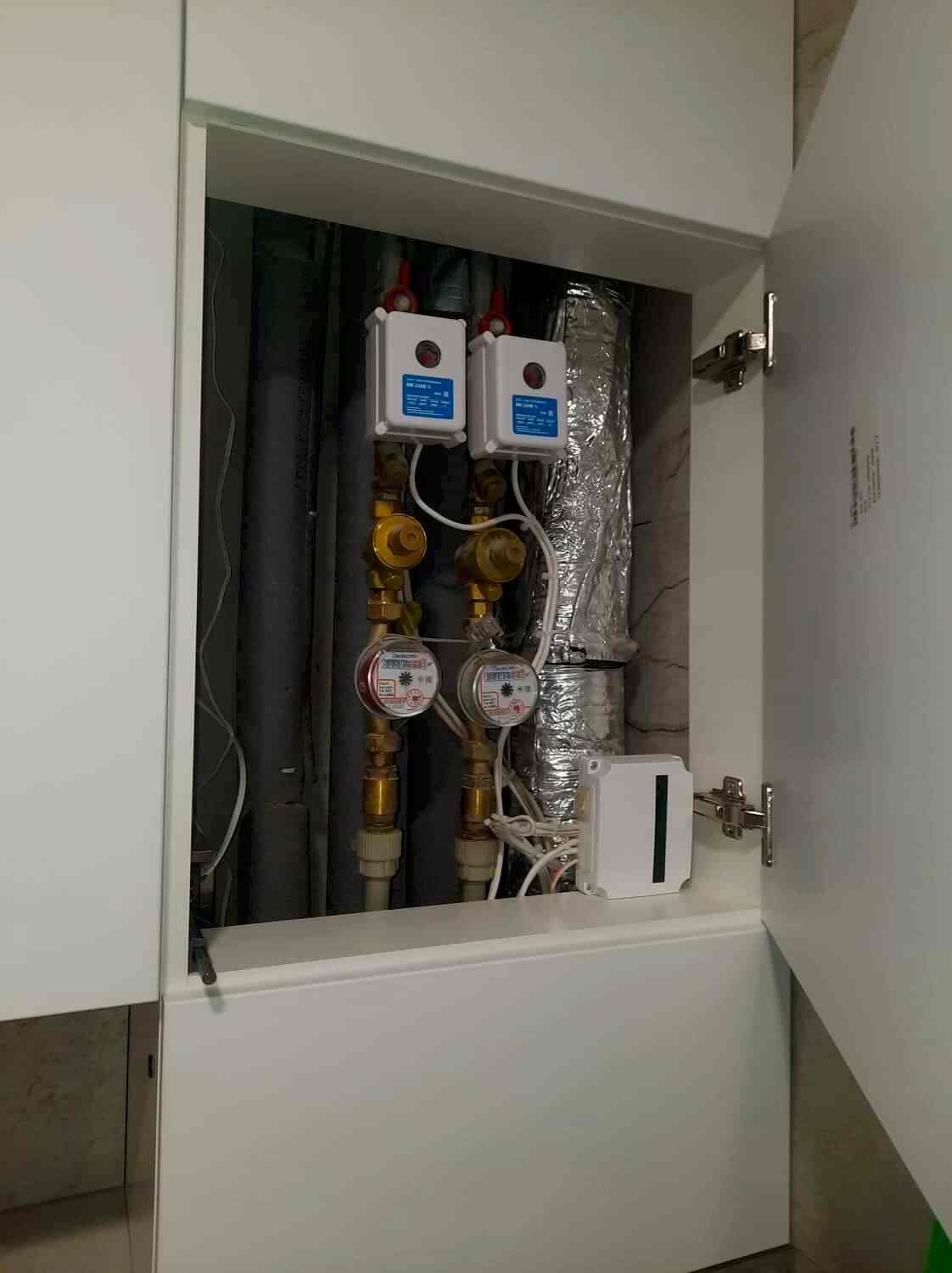 Для управления шторами выбраны электрокарнизы от фирмы «Онвиз», которые известны своей бесшумностью и гарантией на 5 лет. Напольный конвектор используется для обеспечения комфортного тепла, а защитой от протечек служит электропривод Нептун с беспроводным датчиком протечки Smart Water. Этот датчик способен автоматически определить наличие или отсутствие протечки и при необходимости перекрыть подачу воды. Pin Up к серверу умного дома, он также настроен на отправку СМС-уведомлений о протечке на мобильный телефон.